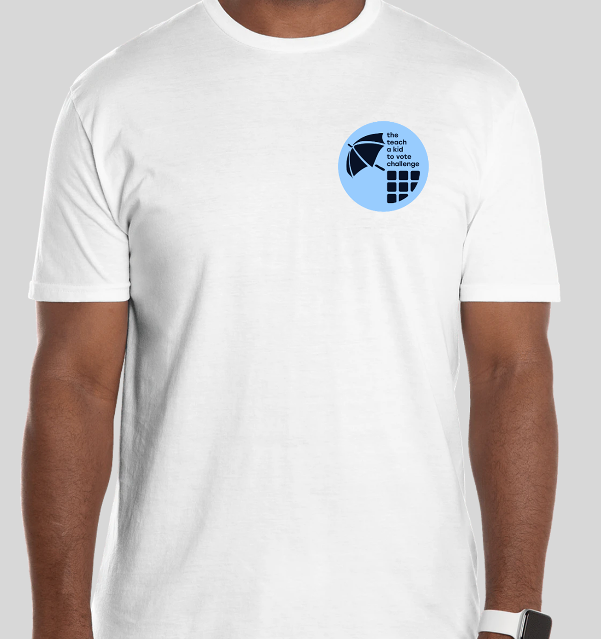 The “I Taught a Kid to Vote” design inverts the color palette to stand out while maintaining unity across the set. A peace sign with two smiley faces represents the intergenerational connection at the heart of the message and puts emphasis on the idea of teaching and mentorship.